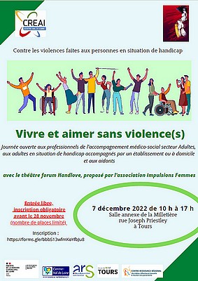 Le CREAI organise, les 5 et 7 décembre 2022 à Châteauroux et à Tours, deux journées de sensibilisation et d'échanges sur les violences faites aux personnes en situation de handicap, avec le théâtre forum HandLove proposé par l'association Impulsions Femmes.